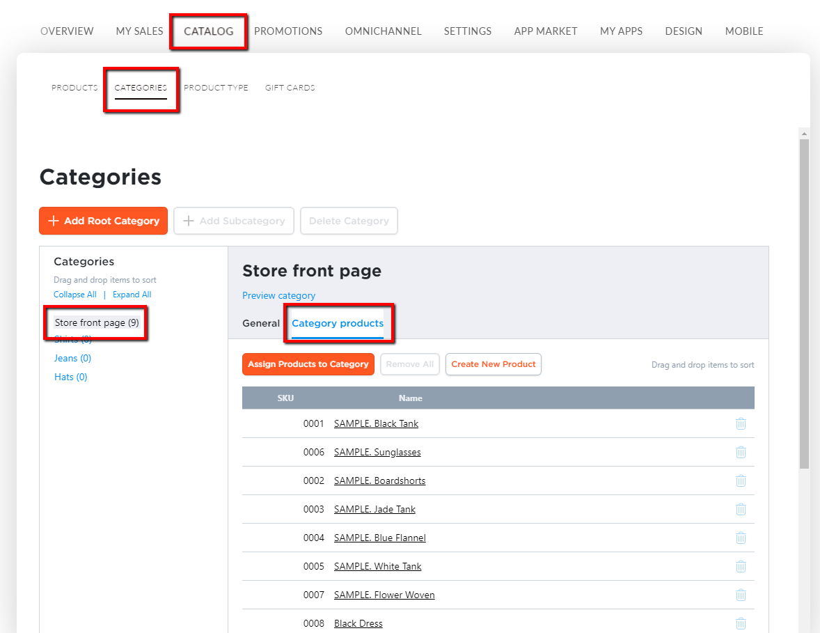 To feature products on the Store Front page, navigate to E-Commerce tile, Catalog, Categories, Assign Products to Category