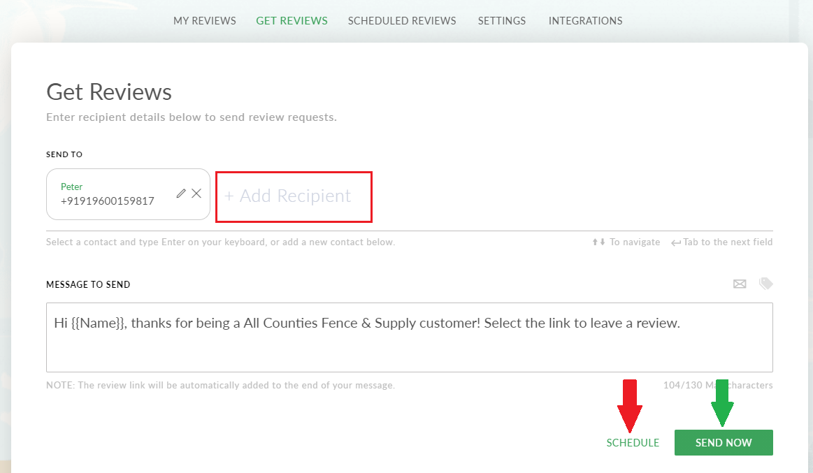 1. To search for recipients, select the Get 5 Star Reviews tile. 2. Select the "Get Reviews" Tab. Start typing the name or contact info of the recipient. We will locate them if they have already been added.